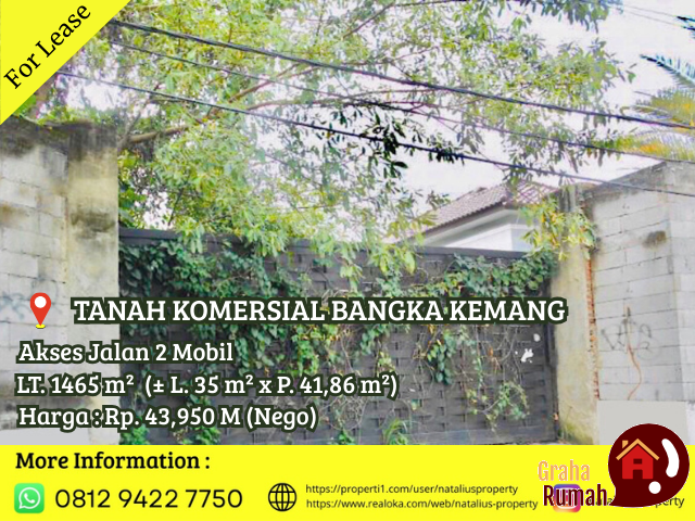 Disewakan Tanah Komersial Zona Ungu di Bangka Kemang, Minimum Sewa 5 tahun, Hadap Utara, Dimensi ± L. 35 m² x P. 41,86 m², Akses Jalan 2 mobil, Legalitas Dokumen Clear & Clear.