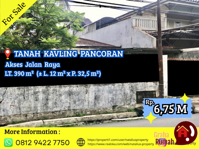 Jual Tanah Kavling di Pancoran, Hadap Utara, Dimensi ± L. 12 m² x P. 32,5 m², Akses Jalan Raya dan dilalui Angkutan Umum/Angkot. Peruntukan sangat Cocok untuk dijadikan Hunian, Kost, Ruang Usaha, Minimarket, Gudang Toko Online & Kantor.