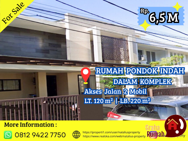 Jual Rumah Pondok Indah Dalam Komplek Siap Huni, Hadap Utara, Dimensi 8 x 15 m2, Depan Taman, Akses Jalan 2 mobil.